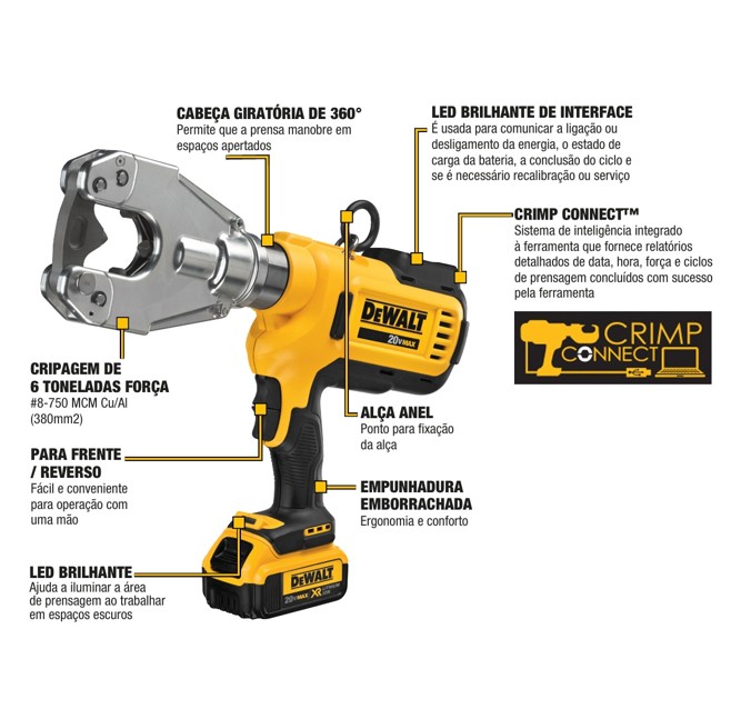 Inclui: (1) Ferramenta de Crimpagem (2) Baterias LI-ION 20V Max* 4Ah (DCB204) (1) Carregador Bivolt (1) Alça de ombro (1) Maleta Plástica